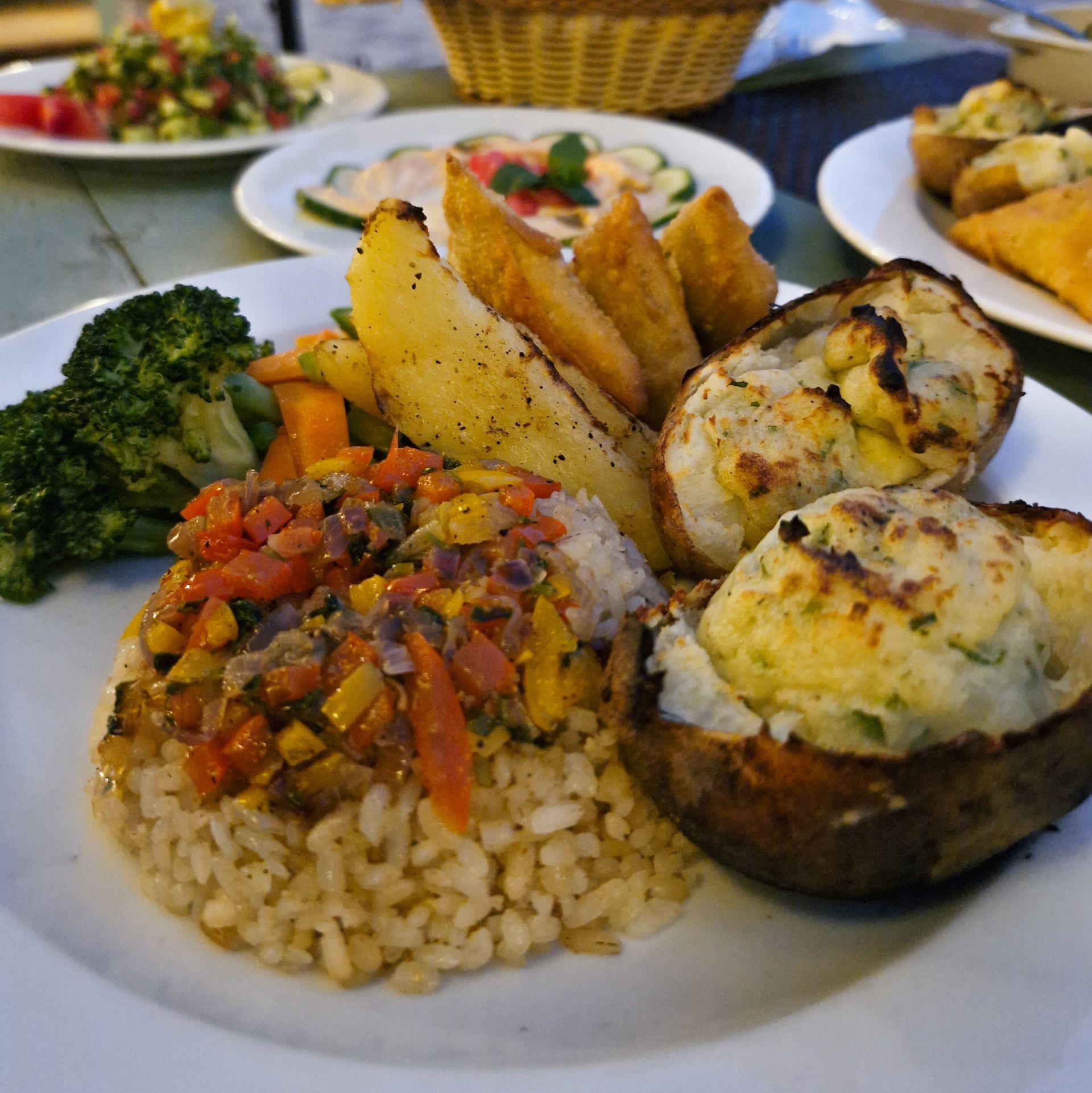 Falafel · Stuffed vegetables · Cheese sambousek · Baba Ghanoush · Garlic bread · Oriental salad — 17.50 USD